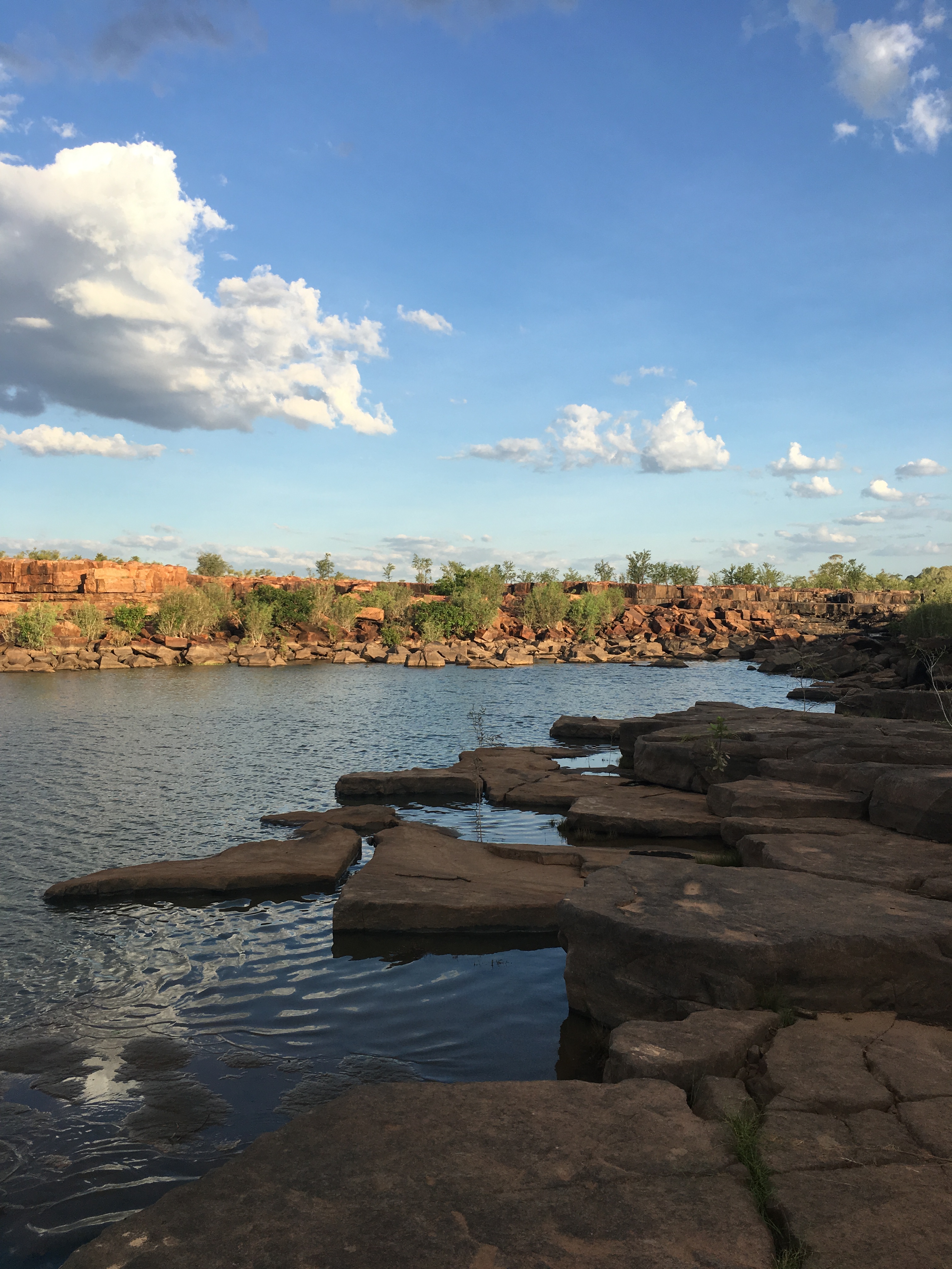 Due to some places along the Gibb River Road not being open yet, we phoned Ellenbrae Station, a couple of hundred km along the GRR to see if they had any work for a week or so. Luckily for us, Larissa and Logan, the young managers of the station gave us food and board for a few hours work each day – which was a great experience! Ellenbrae are famous for their scones and they have a few cabins and a campground – all tourism now, not a working station – although there are some cattle there. Sam found herself making up rooms, gardening, chook herder, baby sitter to their gorgeous 1yr old Cody. Chris found himself on a tractor – grading the 5km driveway and the airstrip, driving the rockin’ rodeo, lighting the donkey (hot water for the campground), making shelves and doing odd jobs (cleaning up the garden shed, storeroom and workshop!). We ended up staying for 2 weeks – thanks so much for the experience Logan & Larissa. We had the afternoons off, so went for a drive to Durack Falls – and did some 4 wheel driving – in the hope of catching a barra – but unfortunately the West has had a bad wet season, like Darwin, so not a lot of water (and no fish!).