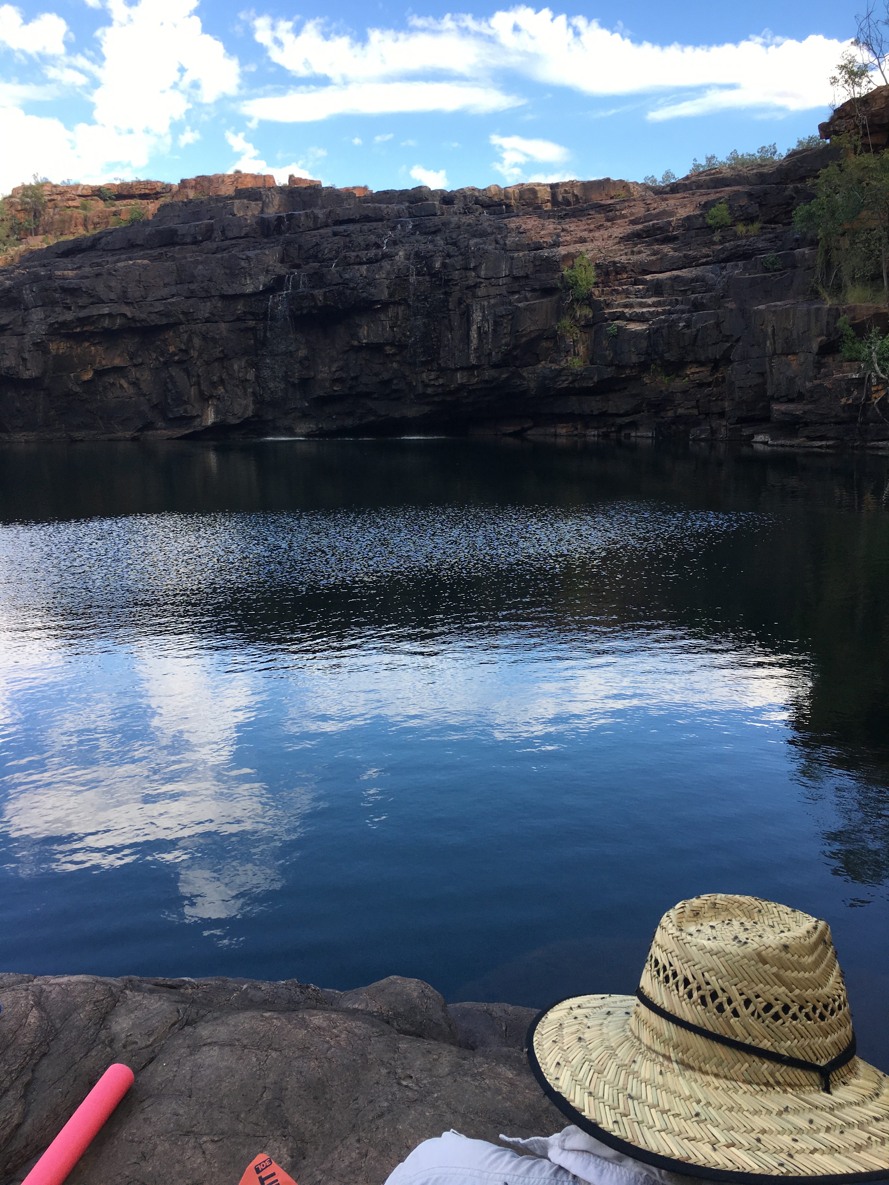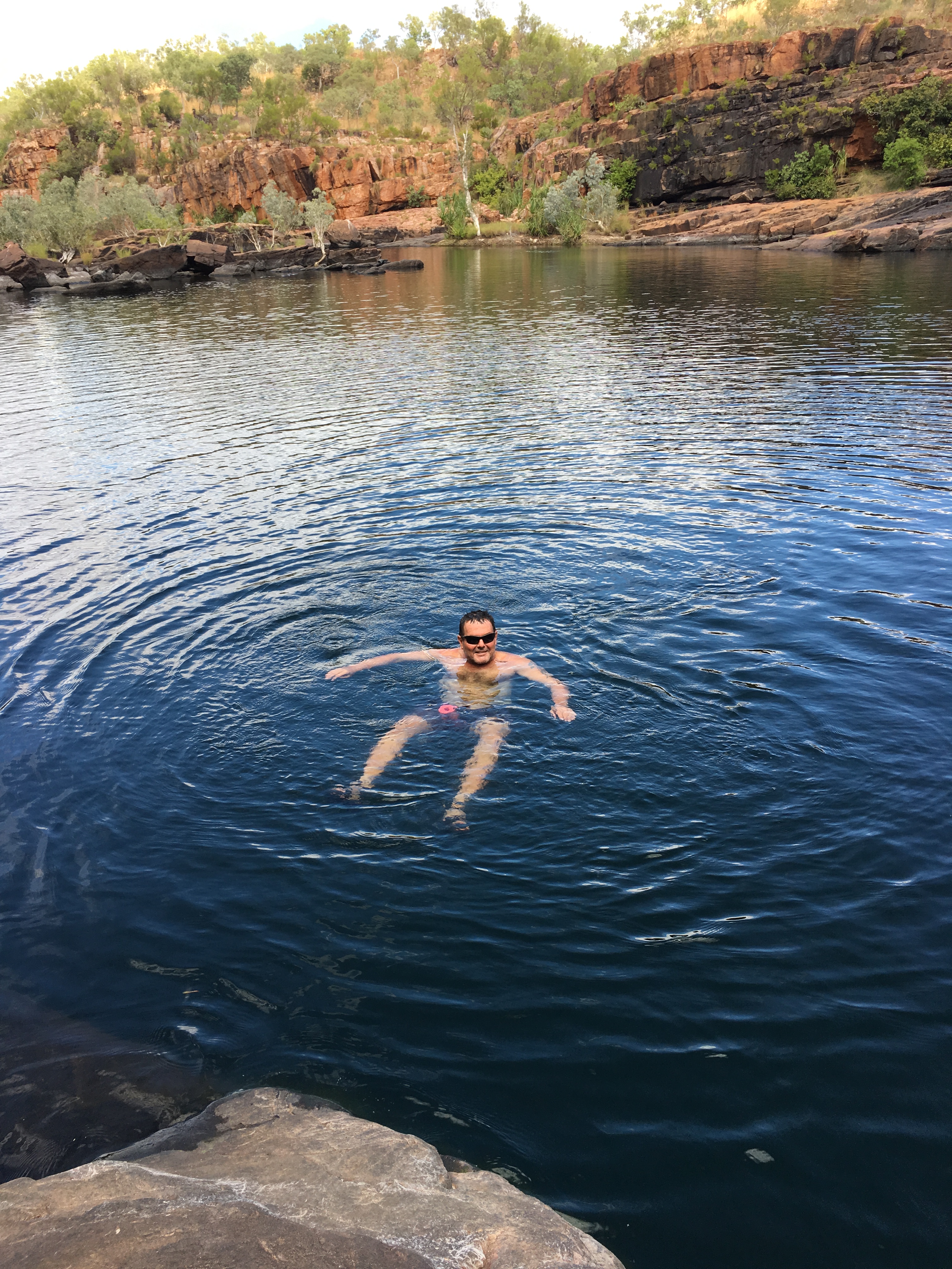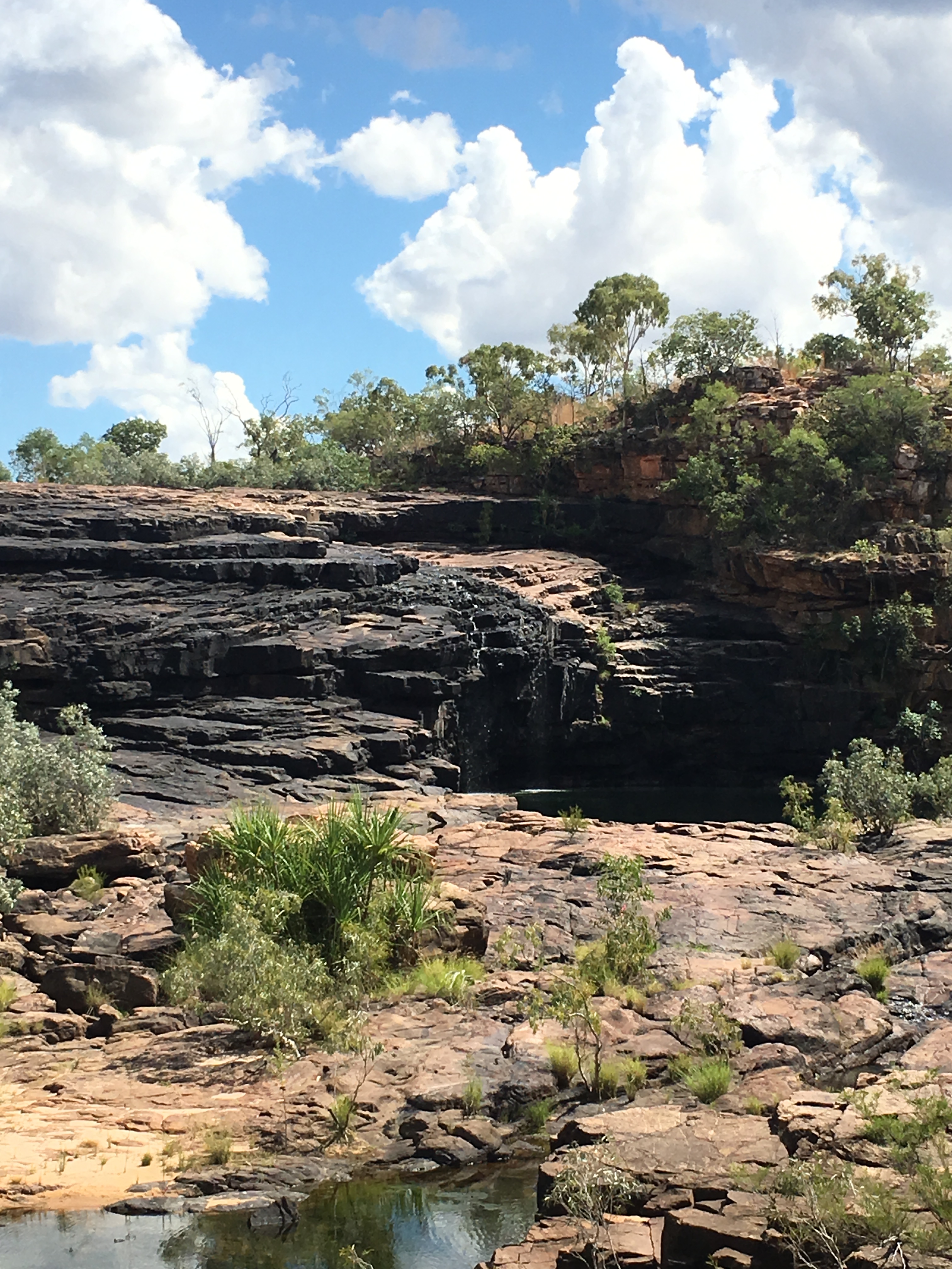 Normally there is a tinnie that ferries you across the waterhole by the campground but that wasn’t arriving until the next day (WA – wait awhile) so we had to swim across! This then gets you started on the arduous 2.5km trek up and down ranges and over rocks to the beautiful falls…well worth it!