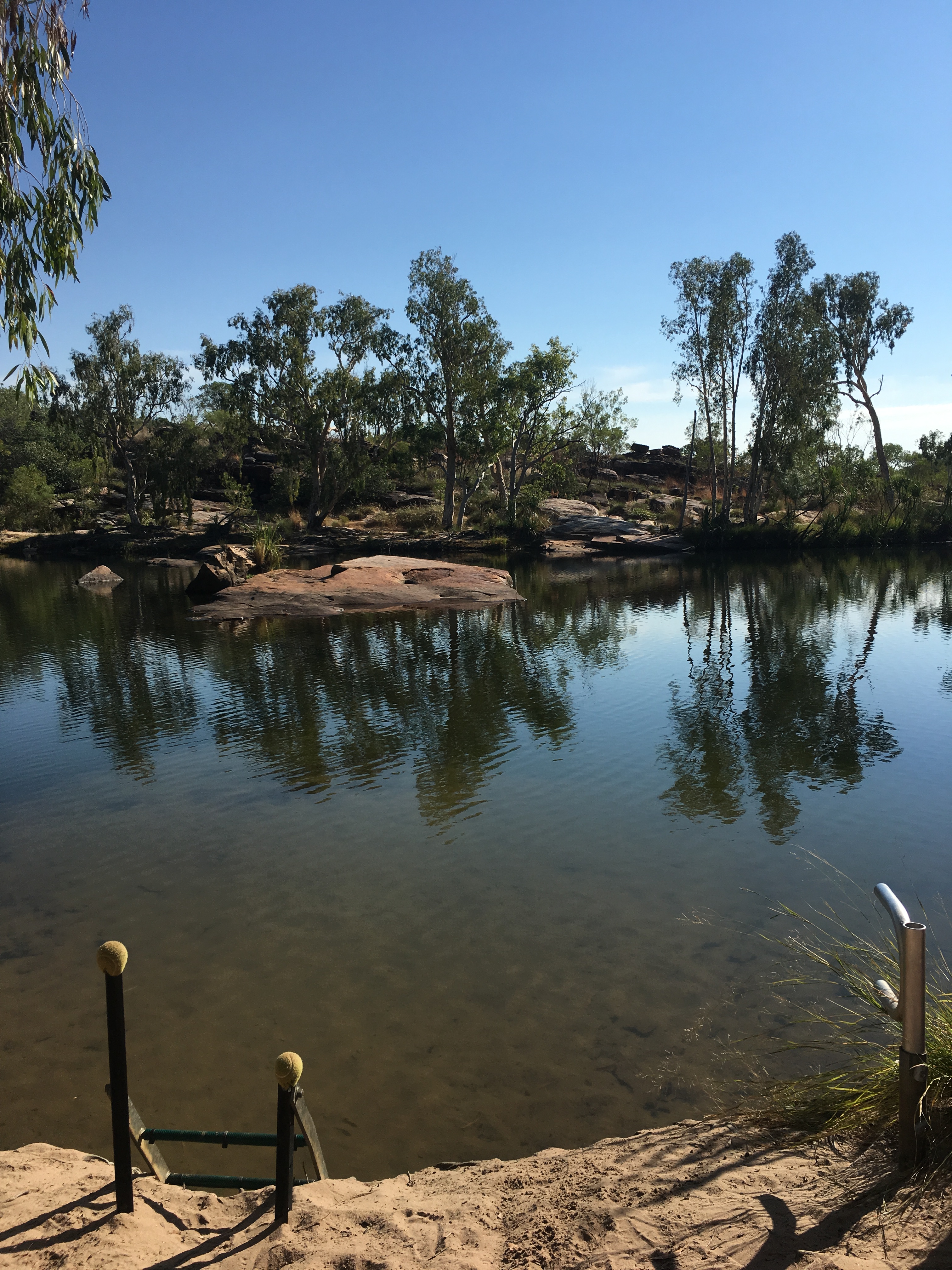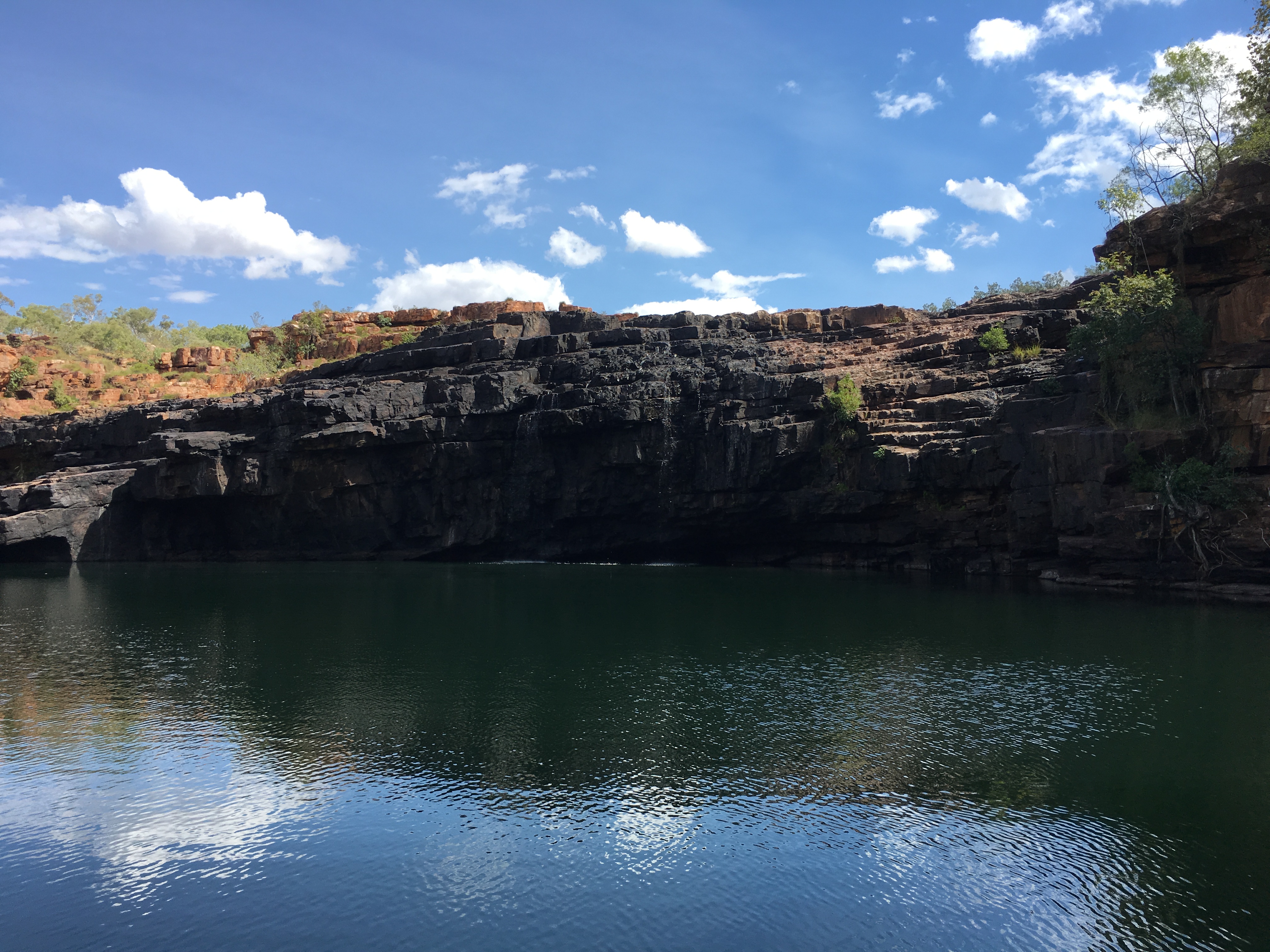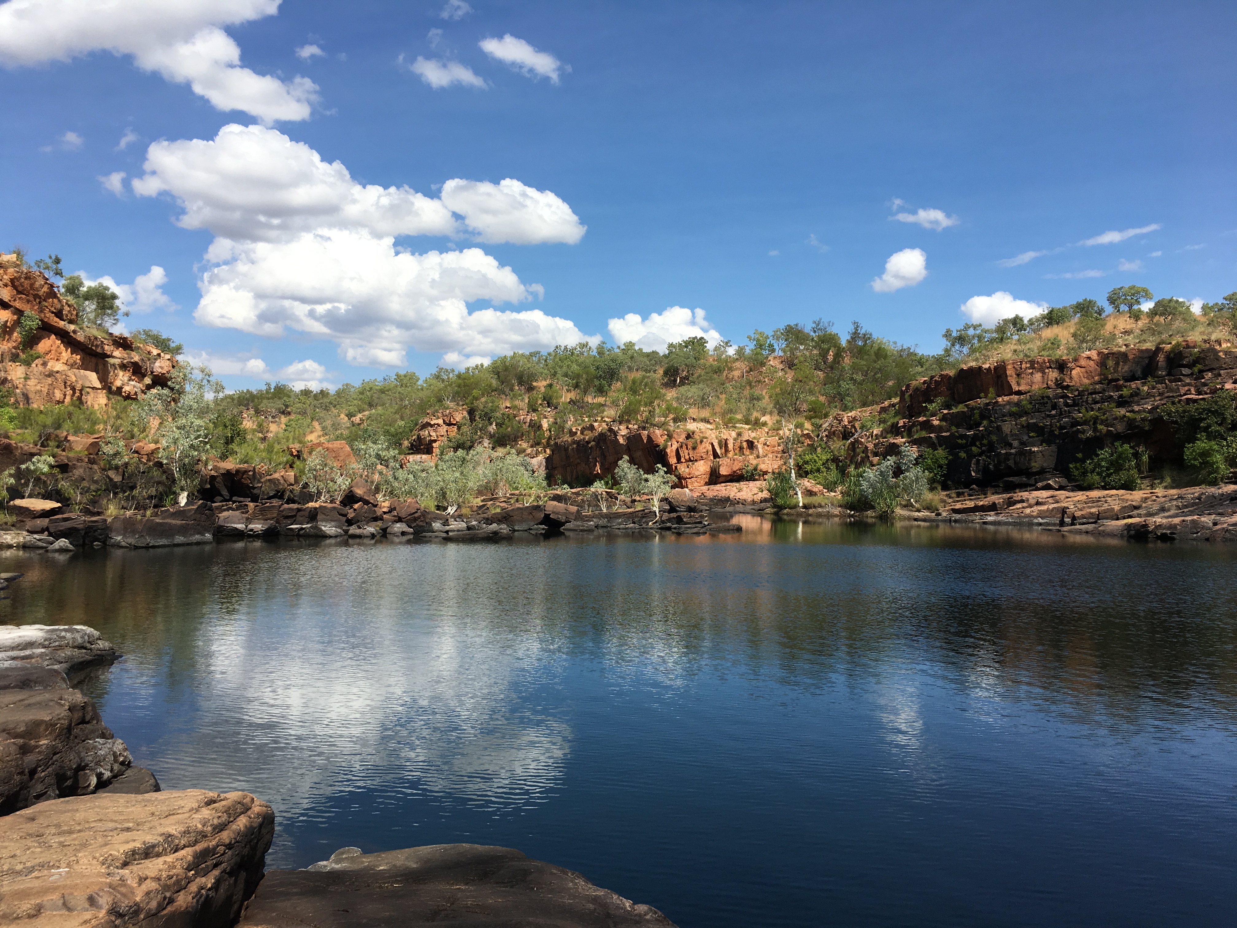 Normally there is a tinnie that ferries you across the waterhole by the campground but that wasn’t arriving until the next day (WA – wait awhile) so we had to swim across! This then gets you started on the arduous 2.5km trek up and down ranges and over rocks to the beautiful falls…well worth it!